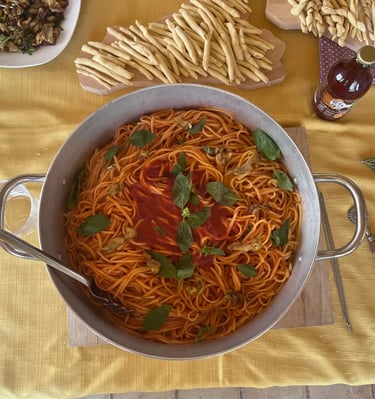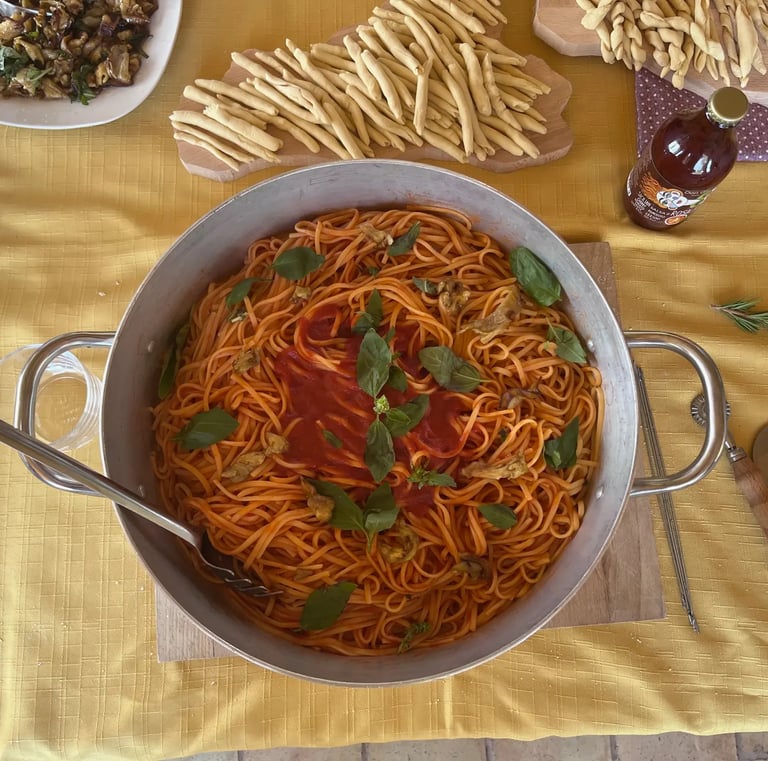 Durante il corso, sotto la mia guida, imparerete a preparare la pasta fresca a mano, esplorando le farine siciliane e le ricette tramandate da mia Nonna Rosalia. Dopo aver preparato l'impasto e lasciato riposare per circa 30 minuti, utilizzeremo questo tempo per preparare insieme un sugo tradizionale siciliano. Successivamente, modellerete la pasta nelle forme tipiche siciliane, che si uniranno perfettamente al sugo appena preparato, creando un piatto autentico e ricco di sapori. Infine, passeremo all'assaggio di quello che avete preparato, e siamo sicuri che il risultato sarà eccellente! Chiuderemo l'esperienza con un dolcino siciliano fatto in casa e un bicchierino di limoncello, preparato da noi.